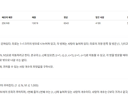 백준 11048 / 이동하기 다이나믹 프로그래밍 문제 가중치는 같지만 사탕을 가져올 수 있는 최대값을 문제이기 때문에 BFS로 풀 수 없다. 다양한 점화식이 있지만 가장 간단한 방법을 사용했다. D[i][j]가 i,j에 도착했을때 가진 사탕의 최대값, map[i][j]가 i,j에 놓인 사탕의 개수라 가정했을 때, 위에서 왔을 경우 : D[i][j] = D[i-1][j] + map[i][j] 왼쪽에서 왔을 경우 : D[i][j] = D[i][j-1] + map[i][j] 왼쪽 위 대각선에서 왔을 경우 : D[i][j] = D[i-1][j-1] + map[i][j] 이기 떄문에 D[i][j]는 max(D[i-1][j], D[i][j-1], D[i-1][j-1]) + map[i][j]이 된다. 문제의 조건인 (1,1)에서 시작하여 (n,.. 백준 15558 / 점프 게임 최단거리가 있으면 갈 수 있다라는 뜻이기 떄문에 BFS로 풀 수 있다. n보다 큰 모든 칸을 갈 수 있는 칸으로 설정했고, k의 최대치가 100000으로 맵의 크기를 200000으로 설정했다. tuple을 사용하여 시간초를 추가해주었다. 시간초는 뒤로 이동하는 경우에만 영향을 준다. 코드 123456789101112131415161718192021222324252627282930313233343536373839404142434445464748495051525354555657585960616263646566676869707172#include#include#include#include#include#include using namespace std; int map[2][200000];bool check[2.. 백준 6087 / 레이저 통신 하다가 로직이 너무 무식한데? 싶으면 빨리빨리 손절하고 다시 세우자 최단경로가 아닌 방향을 최소 몇번 꺾어야 되는지 묻는 문제이다. 방법이 도무지 떠오르지 않아 다른 사람들의 코드를 참고했다. (ㅠㅠ) 로직은 이렇다. 첫번째 C(시작점)에서 4방향으로 벽이나 밖에 부딪힐때까지 선을 긋는다. (선을 그으면서 dist를 체크해준다.) 선이 그어진 부분에서 다시 4방향으로 선을 긋는다. (이미 선이 그어진 곳이라면 긋지 않는다.) 이를 반복하면 갈 수 있는 모든 빈칸에 dist가 체크되는데 도착점의 dist에서 1를 빼주면 답이다. 결국 거울의 개수를 생각하면서 푸는 문제가 아닌, 몇번의 직선으로 도착점에 도달할 수 있는 가에 대한 문제로 생각해서 풀면 더욱 쉽다. 코드 123456789101112131415.. 백준 4991 / 로봇 청소기 총 n개의 쓰레기를 치우는 최소거리는 치우는 순서에 따라 다르다. 그렇기에 1,2......, 최대 10번째 쓰레기를 치우는 순서를 모두 정한 후 최소값을 구하면 된다. 총 10!(>300만)개의 경우의수가 생기니 next_permutation 안에서 bfs를 매번 돌리면 시간초과가 뜬다. 해결법은 로봇청소기와 쓰레기 n개 사이의 거리를 모두 구해놓는 것이다. 쓰레기가 10개라고 가정하면 로봇청소기와 쓰레기 사이의 거리 : 10개 쓰레기와 쓰레기 사이의 거리 : 10C2개 총 55개의 거리를 BFS로 구하면 된다. 코드 12345678910111213141516171819202122232425262728293031323334353637383940414243444546474849505152535455565.. 백준 9328 / 열쇠 난 아직 멀었다는 생각이 들었다. 쉽게 풀 수 있는 문제를 어렵게 접근했던 것 같다. 처음엔 문제의 조건 그대로 구현하려했다. BFS를 돌리되, priority_queue를 이용하여 획득한 파일의 개수, 좌표, 획득한 키(string으로 저장), 획득한 파일의 좌표 를 계속 넘기며 정답을 찾으려 했다. 50%에서 자꾸 메모리 초과가 나서 다 지우고 로직을 새로 세웠다. 문제는 쉽다. 우선, 상근이는 빌딩 밖으로 나갈 수 있기 때문에 맵 주변에 빈칸을 생성해준다. 열쇠나 파일을 찾을 때마다 다시 0,0,으로 돌아와 bfs를 돌리면 된다. 문을 열거나 파일을 찾으면 맵을 빈칸으로 갱신하고 다시 0,0으로 돌아온다면 그 문을 지나가거나 파일이 있던 곳에 접근할 수 있다. 열쇠를 획득하는 건 map을 사용했다... 백준 9376 / 탈옥 이 문제를 단번에 풀었다면 나는 당장 하산했을 것이다. 처음 문제를 풀었을 때 여러가지 해결법이 떠올랐다. 그중 가장 그럴 듯 했던건 모든 문의 좌표를 받고 0개를 열었을 때, 1개를 열었을 때, 2개를 열었을 때 ...... n개를 열었을 때 탈옥에 성공하는 문의 최소개수를 구하는 방법이었는데. 한 케이스당 bfs를 2번씩 해야되니 시간초과에 걸렸다. 맵이 작았으면 괜찮았을 텐데.. 이 문제의 해결법은 이렇다. 죄수1과 죄수2 그리고 맵 밖에 있는 사람이 있다고 가정하자. (문제에 힌트가 있다. 상근이는 어디에나 있을 수 있다고..) 맵도 바꿔준다. 맵의 가장자리 부분에 빈공간(.)를 추가시켜준다. 그리고 죄수1과 죄수2 밖의사람의 모든 dist를 bfs로 구한다 이떄 문이 아닌 빈 공간을 지나가는 경.. 백준 12851 / 숨바꼭질 2 다른 숨바꼭질 문제는 경로를 출력하는 문제였던 것 같다. 그떄 여러가지 답이 가능해서 '스페셜 저지'가 붙어있던거 같고. 이 문제는 최단경로를 출력함과 동시에 몇가지 경로가 가능한지에 대해 묻는 문제다. 최단경로를 출력하는 방법은 숨바꼭질4(https://naivep.tistory.com/22) 참고. 최단으로 갈 수 있는 경로가 몇개 있는지 알아내는 방법은 현재 인덱스까지 올 수 있는 방법이 몇개 있는지 담는 cnt[인덱스] 배열을 만들어 check가 true임에도 next의 위치에 가는 경로가 최단경로와 같다면 cnt를 늘려주는 방법이다. 그림으로 보면 5까지 가는 최단경로가 2, 9까지 가는 최단경로가 2라고 가정하자. 10은 아직 들린적 없다. 우선 5가 10에 접근한다. dist[10]은 3이된.. 맵(map) 클래스 배열의 인덱스로 String이나 큰 수를 넣고 싶은데 불가능하다면, #include map은 STL(Standard Template Library)이 제공하는 자료구조 중 하나. map의 배개변수